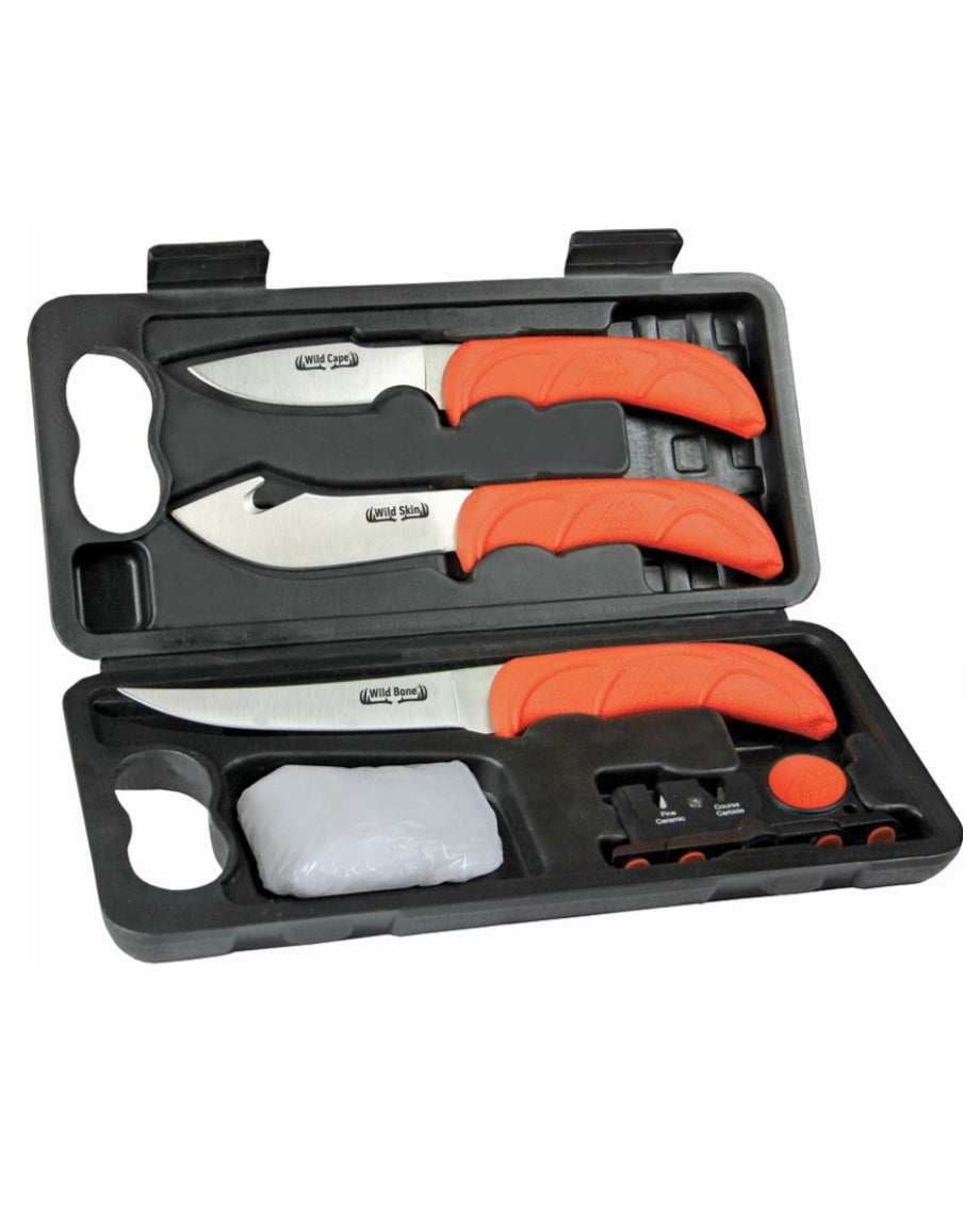 Satin finish stainless blade. Orange rubberized TPR Handle. Six piece set includes 9.5" overall fillet/boning with 5" blade, 8.5" overall guthook skinner with 4" blade, 8" overall caping with a 2.5" blade, 2 stage sharpener, and game cleaning gloves. Hardside carrying case.